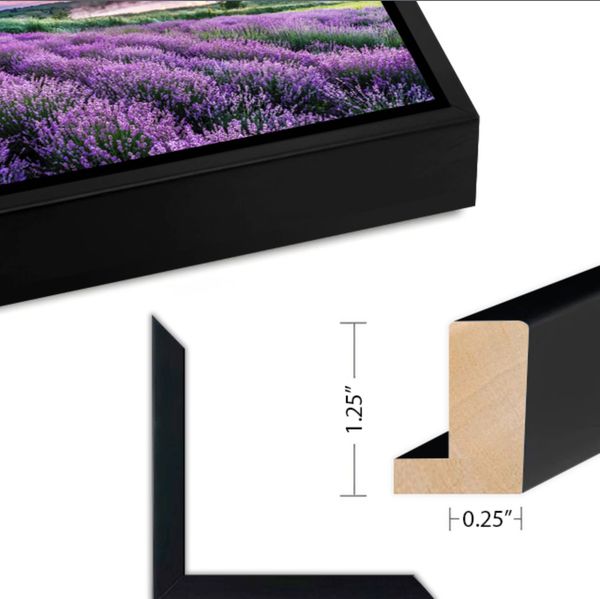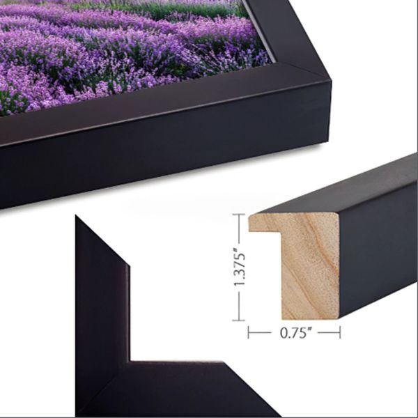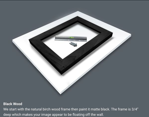 We start with the natural birch wood frame then paint it matte black. The frame is 3/4” deep which makes your image appear to be floating off the wall.